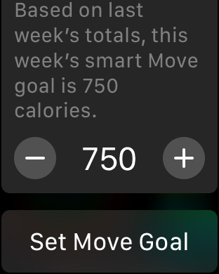 In order to change your daily Move goal, run the Activity app on the Apple Watch, and do a firm press anywhere on the screen. Then tap on Change Move Goal, and you will see the current Move goal (calories). You can adjust your daily Move goal by tapping on the + or – buttons, or by rotating the Digital Crown. Tap the Update button to set the new move goal, or tap Cancel to return to the Activity screen without changing your Move goal.