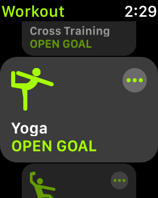 Each workout type in the list will show the type of the workout, and the most recent goal for that workout type – Open Goal, Time, Calories or Distance. If you want to choose the goal that is shown, just tap on the workout type, and the workout will begin after a 3 second countdown. If you want to choose a different goal, tap on the three dots in the upper right corner of the workout type, choose the desired goal, and then tap the Start button.