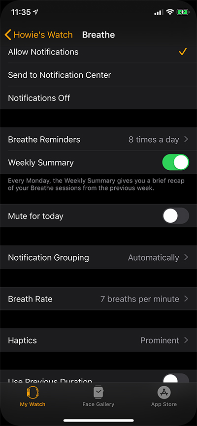 You can choose if you want to receive the Weekly Summary every Monday. The Weekly Summary gives you a brief recap of your Breathe sessions from the previous week. You can toggle the Weekly Summary notification on or off by tapping the switch next to Weekly Summary.