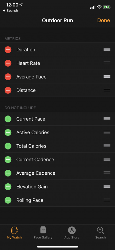 To change what will be displayed during a workout, tap on the Edit button in the upper right corner. All of the metrics that are in the Metrics section will have a Delete button on the left and a Reorder button (three bars) on the right. If there are less than five metrics in the Metrics section then the metrics in the Do Not Include section will have an Add button on the left and a Reorder button on the right.