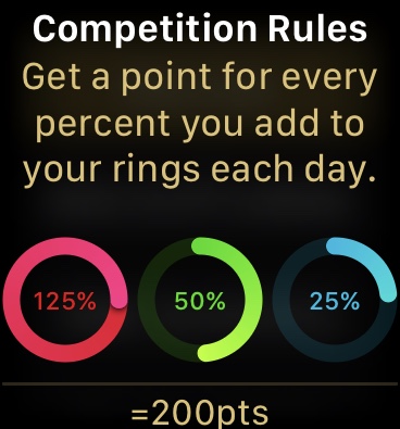 During each of the seven days of the competition, you each get one point for every percent you add to your rings. You can get a maximum of 600 points each day. Whoever has the most points at the end of the seven days is the winner of the competition.