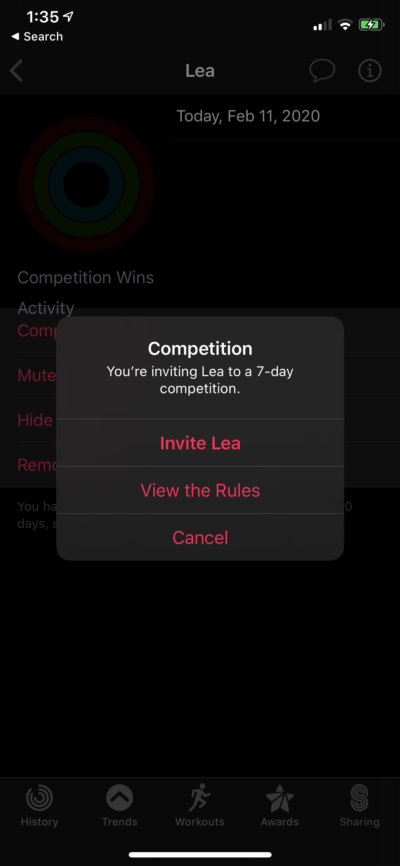 Once you have set up sharing in the Activity app on the iPhone you can invite a friend to share activity and to join a competition.