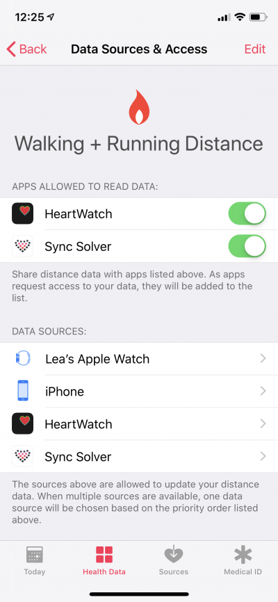 Tap Data Sources & Access to see which apps or devices have requested access to the selected data type and which apps or devices have been granted access. Apps that have requested to read data are listed under Apps Allowed To Read Data. Those that have been given permission to read data will be shown with the on-off switch in green. Permission can be given or revoked by tapping on the switch next to the app name.